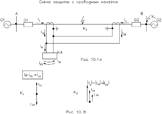 рис. 10.1. Данная защита применяется на небольших расстояниях (несколько сотен метров). На концах защищаемого объекта устанавливаются трансформаторы тока с одинаковым коэффициентом трансформации. Их вторичные обмотки на одноименных фазах соединяются проводами и подключаются к обмотке дифференциального реле так, чтобы при КЗ в защищаемой зоне определялся ток в месте повреждения. Ток