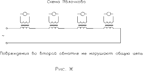 1876 г. Яблочков Павел Николаевич разработал простую и надежную лампу дугового свечения. В результате она представляла две пары угольных электродов, разделенных каолином. Заслуга Яблочкова – поставил эл. освещение на подобающее ему место. Яблочков предложил и способ включения своих свечей в цепь через трансформаторы с разомкнутой магнитной цепью (1-ый трансформатор у свечи) – см. рис.*.