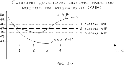 - автоматическая частотная разгрузка (АЧР), позволяющая путем отключения второстепенных мощностей ограничить процесс снижения частоты тока (время срабатывания 5-7с). Пример схемы действия АЧР показан на рис. 2.6. На рисунке показаны очереди АЧР, каждая последующая очередь начинает отрабатывать, если действие предыдущей очереди не привело к остановке снижения частоты. Отнесение нагрузки к той или иной очереди осуществляется энергосистемой.