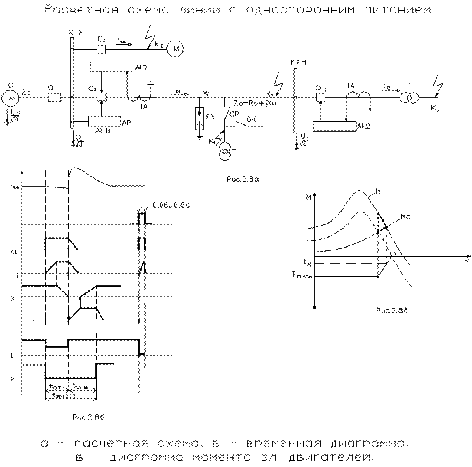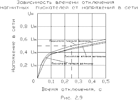 Сказанное поясняет рис. 2.8, на котором приведен пример участка электрической сети и временные диаграммы режима отключения от КЗ и послеаварийного АПВ. Кроме того, на рис. 2.9 приведена зависимость времени отключения магнитных пускателей от напряжения в сети.