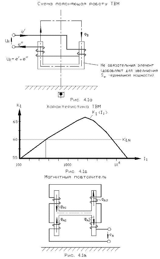 Магнитными ИП тока обычно называются устройства, имеющие обмотку, индуктивно связанную с проводом, ток в котором подлежит измерению. Это также одна из разновидностей трансреакторов, но имеющая очень простую и дешевую конструкцию. Кроме того, магнитные ИП тока имеют приемлемую точность для целей РЗ, но их вторичная мощность также очень невелика. Иначе их еще называют дистанционные электромагнитные ИПТ. Рассмотрим получивший широкое распространение в 80-х годах прошлого столетия магнитный трансформатор тока, который представляет собой магнитный зонд индукционного действия. Он применяется для защит (35...220) кВ. Для целей измерения также создаются экспериментальные образцы. Из известных конструкций УИП, ТВМ, СС-10. Приведем схему, поясняющую работу ТВМ (рис. 4.1а), и вкратце перечислим те проблемы, с которыми встретились разработчики: