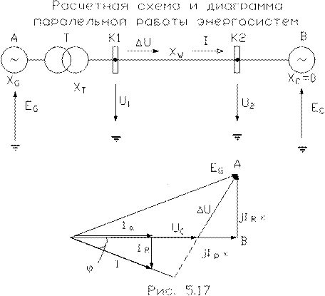 Расчетная схема и диаграмма параллельной работы энергосистем приведены на рис. 5.17.