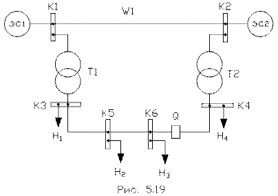 На рис.5.19 приведена схема. Асинхронный ход возможен при отключении межсистемной линии К1, когда межсистемная связь будет обеспечена линиями 110 кВ с большей пропускной способностью. В этом случае синхронизация невозможна и будет происходить деление сети 110 кВ в точке К6.