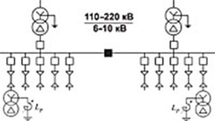 Рис. 2. Схема двухтрансформаторной подстанции с нейтралью, заземленной через дугогасящий реактор.