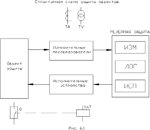 Измерительная часть (измерительные органы, пусковые, контролирующие, реагирующие, выявительные) непосредственно контролирует состояние оборудования, получая информацию о состоянии и параметрах защищаемого объекта через измерительные преобразователи (трансформаторы тока и напряжения), и реагирует на возникновение КЗ и нарушение нормального режима, либо управляя объектом (сигнал на выключатели, пускатели и т.п.), либо предупреждая (указательные реле, сигнальные лампы, сирены и т.п.). Структурная схема защиты объектов приведена на рис.6.1.