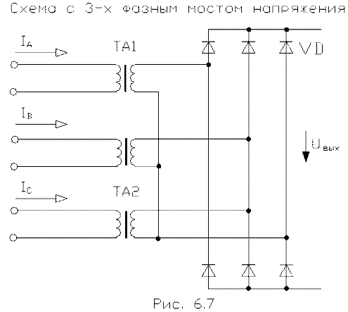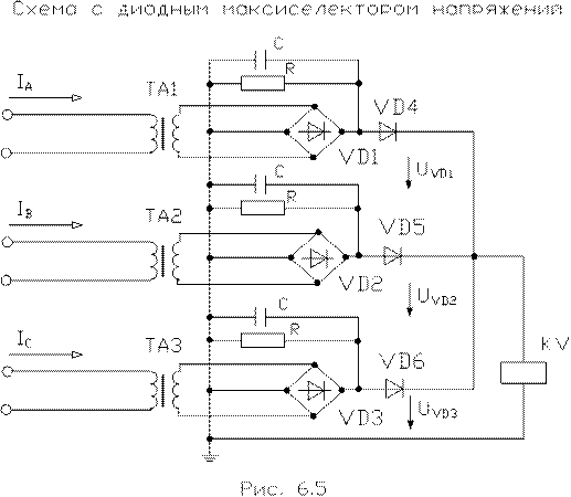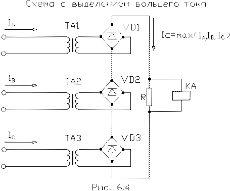 Схема с выделением большего тока представлена на рис. 6.4. Через резистор R протекает ток ведущего промежуточного ТТ (имеющего наибольший в данный момент ток). Схема может применяться как в 3-х фазной сети, так и в 2-х фазной.