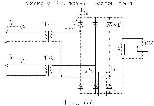 Схема с диодным максиселектором напряжений, реагирующим на средневыпрямленное значение (средневыпрямленное значение удобно для исключения действия высших гармоник) представлена на рис. 6.5. Повышение чувствительности при 2-х фазном КЗ происходит за счет включения на разность фазных токов промежуточных трансформаторов тока. Зачастую выпрямители строят на операционных усилителях.
