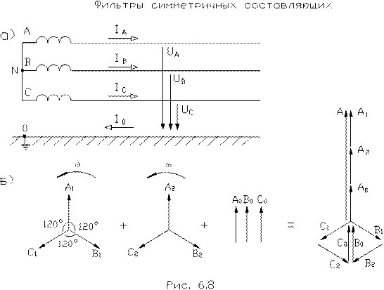 Любую несимметричную систему трехфазных векторов согласно теореме Фортескью можно разложить на три симметричные последовательности. Пример такого разложения для однофазного тока КЗ приведен на рис.6.8. Разложение на симметричные составляющие в релейной защите применяется в так называемых фильтровых защитах, в которых выделяется та или иная последовательность. Чаще всего используются фильтры нулевых составляющих для обнаружения замыканий на землю и фильтры обратных последовательностей, для фиксации несимметричных коротких замыканий. В нормальном режиме доля нулевых и обратных составляющих регламентирована стандартом на качество электроэнергии и составляет незначительную величину. Вследствие этого фильтровые защиты обладают повышенной чувствительностью к аварийным режимам (подробнее см. Фабрикант В.Л., Фильтры симметричных составляющих, М.: Госэнергоиздат, 1962. – 424 с., а также Рожкова Л.Д., Козулин В.С. Электрооборудование станций и подстанций / Учебник для техникумов. – 3-е изд., перераб. и доп. – М.: Энергоатомиздат, 1987. – 648 с).