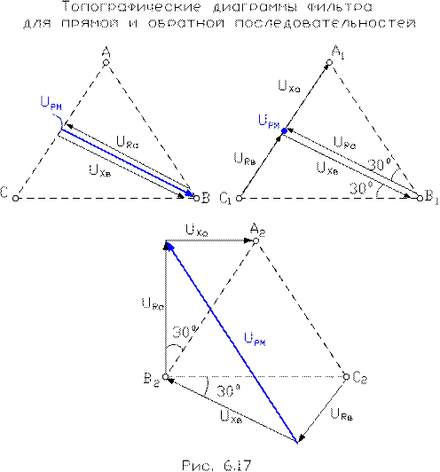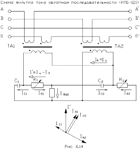 , для прямой последовательности ток фильтра равен нулю. Обратную последовательность исключают за счет того, что в фильтре используются линейные токи (разность фазных токов). Схема фильтров тока обратной последовательности показана на рис.6.13 и 6.14.