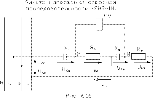 Схема РНФ-1М приведена на рис. 6.16. Топографические диаграммы фильтра для прямой и обратной последовательностей приведены на рис. 6.17. Работа фильтра также основана на взаимном сдвиге на 60 эл.град двух линейных векторов напряжений.