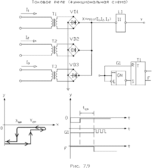 Созданный функциональный набор элементов «Сейм» использовался как для построения защит, так и для выполнения схем автоматики и телемеханики. В качестве примера рассмотрим токовое реле РТ-3К из набора “Сейм” (рис.7.9).