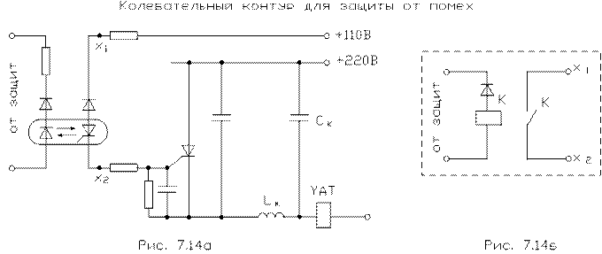 На рис.7.14 показан колебательный контур от помехи, который до 10 мс не приведет к ложному отключению. Он создается либо с помощью оптронного тиристора, либо с помощью герконового реле.