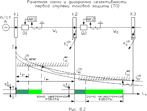 Первую ступень токовой защиты называют токовой отсечкой (ТО). Применение токовой отсечки целесообразно, если она защищает 15-20% длины линии. Максимальный ток ее срабатывания чуть меньше максимально допустимого тока отключения выключателя. Предназначена для повышения быстродействия при отключении ближних повреждений. Первые ступени обычно работают без специально устанавливаемой выдержки времени. Защищаемые ими первые зоны охватывают только часть длины участка ближайшую к месту включения защиты. Защита имеет мертвую зону и не может служить основной защитой, а является дополнительной защитой. Зона защиты на рис. 8.2 ограничена точкой пересечения кривой трехфазного металлического КЗ