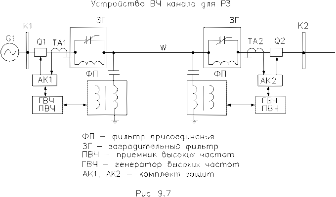 Устройство ВЧ канала приведено на рис. 9.7. Линия связи организуется на фазном проводе ВЛ. Для информационного обмена могут использоваться три диапазона частот (0,3-3,4 кГц – тональный, 4-35 кГц – промежуточный и 12-1000 кГц высокочастотный) Для предотвращения шунтирования сигнала распределенными емкостями подстанций перед входом на подстанцию устанавливают заградительный фильтр. Этот фильтр не оказывает практически никакого сопротивления для частот в полосе 30-300 Гц, но имеет очень высокое сопротивление для частот, используемых в высокочастотном канале (около 500 Ом). Для съема информации предназначен фильтр присоединения. Его сопротивление для промышленной частоты 50 Гц составляет около 1 МОм, а для диапазона частот от 40 до 500 кГц – 75 Ом. Сопротивление самой ВЛ для высокочастотного сигнала составляет порядка 300-450 Ом.