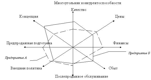 Сравнительная оценка конкурентоспособности предприятий. Этот анализ дает возможность оценить сравнительную силу предприятия и его ближайших конкурентов. Оценка возможностей фирмы позволяет построить многоугольник конкурентоспособности. По каждой оси для отображения уровня значений каждого из исследуемых факторов (в многоугольнике оценка проводилась только по 8 факторам) используется определенный масштаб измерений (очень часто в виде балльных оценок). Изображая на одном рисунке многоугольники конкурентоспособности для разных фирм, легко провести анализ уровня их конкурентоспособности по разным факторам. Очевидно, что возможно построение многоугольника конкурентоспособности также для продуктов-конкурентов и маркетинговой деятельности фирм-конкурентов в целом.