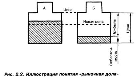Предположим, что две компании, одна из которых производит продукт А, а другая – продукт Б, конкурируют на одном рынке (рис.2.2). Принимаем, что по своим характеристикам продукты А и Б фактически идентичны и поэтому реализуются по одной и той же цене. Однако большее значение показателя рыночной доли продукта Б говорит о том, что его больше продают, а следовательно и больше производят. Из-за большего масштаба производства себестоимость продукта Б ниже, чем продукта А. Вследствие этого и прибыль от реализации продукта Б превышает прибыль, полученную от реализации продукта А. Но не это является главным выводом из проведенных рассуждений.