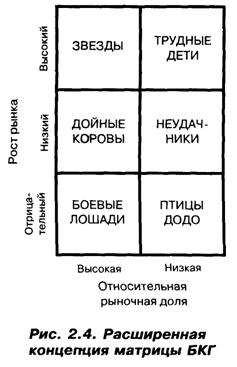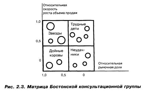 Пересечение этих двух координат образует четыре квадранта. Если продукты характеризуются высокими значениями обоих показателей, то они называются “звездами”, их следует поддерживать и укреплять. Правда, у “звезд” есть один недостаток: поскольку рынок развивается высокими темпами, то “звезды” требуют высоких инвестиций, таким образом “проедая” заработанные ими деньги. Если продукты характеризуются высоким значением показателя Х и низким — Y, то они называются “дойными коровами” и являются генераторами денежных средств организации, поскольку не требуется вкладывать средства в развитие продукта и рынка (рынок не растет или растет незначительно), но за ними нет будущего. При низком значении показателя Х и высоком — Y продукты называются “трудными детьми”, их надо специально изучать, чтобы установить, не смогут ли они при известных инвестициях превратиться в “звезды”. Когда как показатель Х, так и показатель Y имеют низкие значения, то продукты называются “неудачниками” (“собаками”, “догами”), приносящими или малую прибыль, или малые убытки; от них надо по возможности избавляться, если нет веских причин для их сохранения (возможное возобновление спроса, относятся к социально значимым продуктам и т. п.).