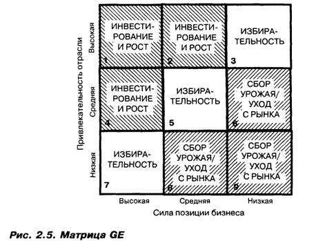 Матрица GE, или матрица Мак-Кинзи (см. конкретную ситуацию в конце данного раздела), используется при оценке привлекательности отдельных СХЕ на основе двух координат: ось Х характеризует силу позиции СХЕ в отрасли, ось Y — привлекательность отрасли. Каждая из этих координат определяется с учетом нескольких параметров (рис. 2.5).