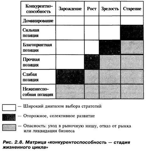 В качестве еще одного подхода к оценке продуктового портфеля можно упомянуть использование матрицы “конкурентоспособность — стадия жизненного цикла”. Анализируемые продукты могут попасть в одну из трех, отмеченных на рис. 2.8, зон выбора стратегий. Наиболее широкий диапазон выбора стратегий имеют “молодые” продукты, занимающие доминирующие позиции на рынке. “Старые”, неконкурентоспособные продукты, расположенные в правом нижнем углу матрицы, требуют наиболее радикальных решений, связанных с резким сокращением или ликвидацией данного бизнеса.