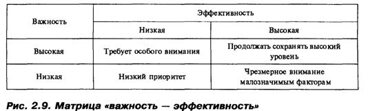 Можно построить матрицу “важность — эффективность” (рис. 2.9), в клеточках которой делаются выводы по результатам анализа тех составляющих внутренней среды, которые размещаются в этих клеточках.