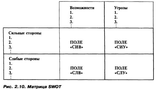 На пересечении разделов образуются четыре поля: “СИВ” (сила и возможности); “СИУ” (сила и угрозы); “СЛВ” (слабость и возможность); “СЛУ” (слабость и угрозы). На каждом из данных полей исследователь должен рассмотреть все возможные парные комбинации и выделить те, которые должны быть учтены при разработке стратегии поведения организации. В отношении тех пар, которые были выбраны с поля “СИВ”, следует разрабатывать стратегию по использованию сильных сторон организации для того, чтобы получить отдачу от возможностей, которые появились во внешней среде. Для тех пар, которые оказались на поле “СЛВ”, стратегия должна быть построена таким образом, чтобы за счет появившихся возможностей попытаться преодолеть имеющиеся в организации слабости. Если пара находится на поле “СИУ”, то стратегия должна предполагать использование силы организации для устранения угроз. Наконец, для пар, находящихся на поле “СЛУ”, организация должна выработать такую стратегию, которая позволила бы ей как избавиться от слабостей, так и попытаться предотвратить нависшую над ней угрозу.