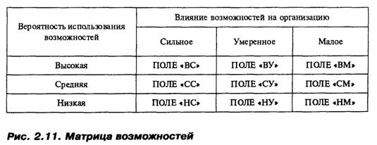 Для оценки возможностей применяется метод позиционирования каждой конкретной возможности на матрице возможностей (рис. 2.11).