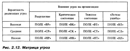 Похожая матрица составляется для оценки угроз (рис. 11). Те угрозы, которые попадают на поля “ВР”, “ВК” и “СР”, представляют очень большую опасность для организации и требуют немедленного и обязательного устранения. Угрозы, попавшие на поля “ВТ”, “СК” и “НР”, также должны находиться в поле зрения высшего руководства и быть устранены в первостепенном порядке. Что касается угроз, находящихся на полях “НК”, “СТ” и “ВЛ”, то здесь требуется внимательный и ответственный подход к их устранению.