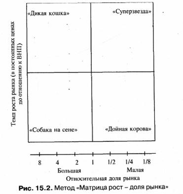 Указанный на рис. 15.2 квадрат разбит линиями на четыре квадранта, имеющих два темпа роста рынка: высокий и низкий.