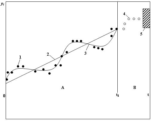 1). На основе значений временного ряда на предпрогнозном периоде (интервале наблюдения) с использованием метода наименьших квадратов определяются коэффициенты уравнения тренда yt, видом которого задаются. Обычно для описания тренда используются полиномы различных порядков, экспоненциальные, степенные функции и т. п.