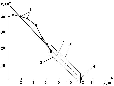 3, 3' – границы интервального прогноза; 4 – время расхода запаса