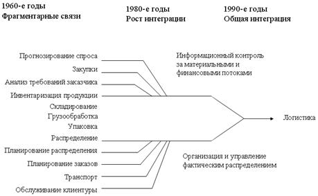 Движущая сила интеграции. Современный практический потенциал логистики был предугадан многими ведущими экономистами мира еще в середине XX века. Однако до начала 1980-х годов логистика проходила спокойный, эволюционный путь развития, оценивая и формируя взаимосвязи между отдельными фрагментарными звеньями предпринимательской деятельности. И только активно развернувшаяся в 1980-х годах интеграция мировых хозяйственных связей, рост и усложнение материальных и информационных потоков между территориально разрозненными производствами, формирование новых гибких систем распределения и условиях усиления конкуренции дали новый импульс развитию логистики.