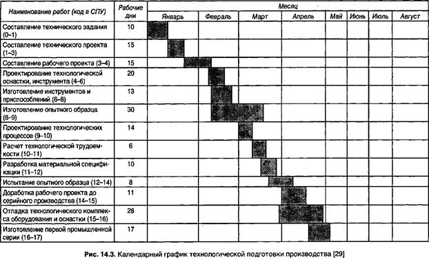 После определения продолжительности всех этапов технологической подготовки производства разрабатывается календарный план ее осуществления в форме линейного (ленточного) или сетевого графика. Линейные графики используются в основном при относительно небольших объемах и продолжительности соответствующих работ. Эти графики просты и наглядны (рис. 14.3).