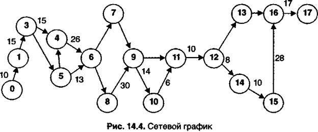Схема планируемого процесса изображается в виде ориентированного графика, называемого сетевым или просто сетью (рис. 14.4.). График состоит из работ и событий. Работой называется тот или иной процесс (например, изготовление опытного образца изделия), а событием — момент завершения работы, в данном случае момент готовности образца, после которого должна начинаться следующая работа. При этом события обозначаются кружками, а работы — стрелками. Продолжительность работ обозначается числом дней или недель и наносится над стрелкой. Полный путь в сетевом графике — это любая непрерывная последовательность взаимозаменяемых событий и работ, ведущая от события (0) исходного графика к завершающему, последнему событию сетевого графика (17). Кроме полных путей (а их несколько) следует различать: путь от исходного события до какого-либо промежуточного события, например (5); путь, соединяющий данное промежуточное событие (5) с завершающим (17); путь между двумя событиями, из которых ни одно не является исходным или завершающим.