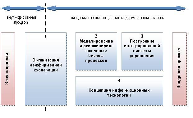 Построение интегрированной системы правленияначинается с организационных изменений (реинжиниринга бизнес-процессов) и создания комплексных моделей планирования и управления цепью поставок. И лишь после синхронизации всех основных бизнес-процессов, разработки стратегии и концептуальных моделей планирования и управления цепью поставок можно приступать к работам по внедрению информационных систем, поддерживающих интегрированное управление цепью поставок.
