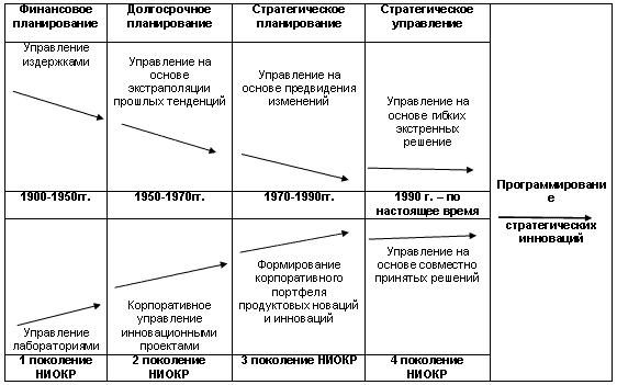 Таким образом, возникновение методологии стратегического управления, что и инновационного менеджмента, принято рассматривать с точки зрения эволюции систем планирования как реакции хозяйствующих субъектов на усложнение внешних условий ведения бизнеса.