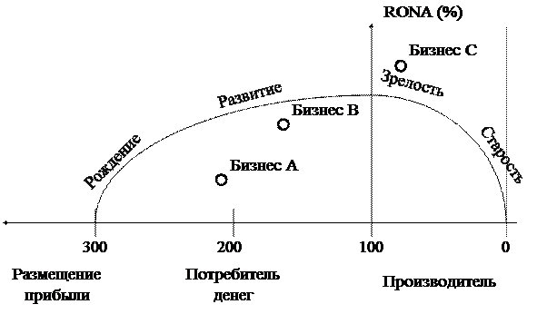 Для обеспечения баланса в бизнес-портфеле модель ADL предполагает использование еще одного специального инструмента - RONA-графа. Граф (здесь данный термин использован не совсем удачно, по сути это рисунок) использует два параметра – показатель RONA, выраженный в процентах, и уровень реинвестиций (рис. 3.2).