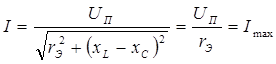 При резонансе напряжений в схеме имеет место равенство напряжений UС = UL и UП = Ur. Кроме того равны индуктивное и ёмкостное сопротивление XL = XC. Ток I электрической цепи: