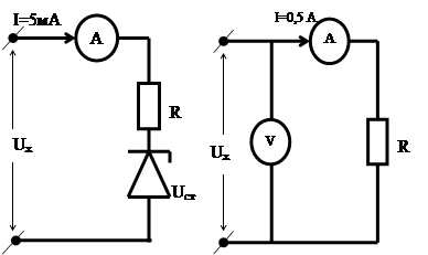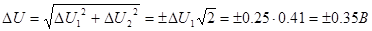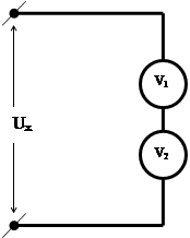 Пример. Определить напряжение Ux и погрешность измерения ΔU по схеме на Рис. 3.5, состоящей из двух одинаковых вольтметров, имеющих следующие метрологические данные: Uном = 10В, класс точности Кv = 2,5. Показания вольтметров Uип1 = Uип2 = 7,5 В.