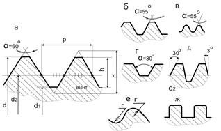 По назначению различают резьбы крепежные и резьбы для винтовых механизмов (рис.3.4). Ниже речь идет только о крепежных резьбах.