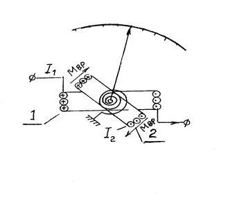 Катушка 1 неподвижна, катушка 2 подвижна и свободно вращается на оси внутри неподвижной катушки. Для подвода тока к подвижной катушке используются две спиральные пружины, которые создают противодействующий момент движению катушки. Вращающий момент определяется из уравнения 4.3, в которое входит электромагнитная энергия двух катушек,