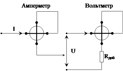 В зависимости от способа соединения катушек электродинамический прибор может быть использован в качестве амперметра, вольтметра и ваттметра. На рис 4.7 показаны соединения катушек при использовании их в указанных выше приборах.