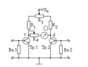 Вольтметр основан на использовании мостовой симметричной схемы, образованной сопротивлениями R1 и R2 и транзисторами Тр1 и Тр2 (рис.5.2). Схема имеет два входа, к которым подводятся напряжения Uвх1 и Uвх2. Выходное напряжение усилителя Uвых снимается с коллекторов транзисторов в точках c-d.