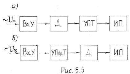 Схема рис.5.5, а состоит из входного устройства (Вх. У), усилителя переменного тока, выпрямителя и измерительного прибора магнитоэлектрической системы. Схема характеризуется высокой чувствительностью, достигаемой непосредственным усилением измеряемого напряжения в сравнительно узком диапазоне частот до 10 МГц. Схема рис.5.5, б состоит из входного устройства (Вх. У), выпрямителя, усилителя постоянного тока и измерительного прибора магнитоэлектрической системы.