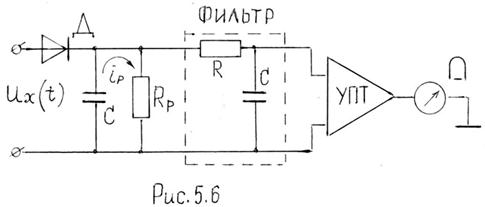 На рис.5.6 приведена схема пикового преобразователя. Схема состоит из диода Д, конденсатора С, разрядного сопротивления Rр, усилителя постоянного тока (УПТ) и измерительного прибора магнитоэлектрической системы (ИП).
