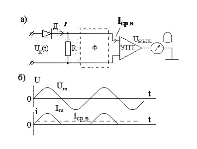 Вольтметры этого типа строятся как с однополупериодным, так и с двухполупериодным выпрямлением. На рис. 5.8,а приведена структурная схема вольтметра с однополупериодным выпрямлением, а на рис. 5.8,б временные диаграммы напряжений на входе и выходе диода. С помощью диода