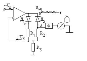 При подключении схемы к источнику напряжения Ux(t) ток начнет протекать когда откроется диод Д1. Это произойдет при равенстве напряжений Ux и U1 – напряжения первого делителя напряжения