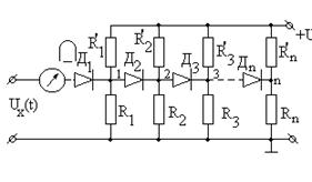 Диодные цепочки формируют квадратичную характеристику за счет сложения начальных участков вольтамперных характеристик нескольких диодов. Схема вольтметра на основе диодной цепочки показана на рис.5.11.
