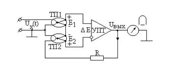 В цепь обратной связи УПТ включен ТП2, через подогреватель которого проходит ток Iвых, определяемый напряжением Uвых. Выходной величиной ТП2 является термо ЭДС Е2. Термо ЭДС Е1 и Е2 включены встречно и на вход УПТ поступает напряжение D Е.