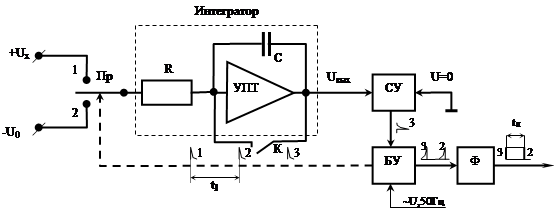На рис.8.3. представлена блок-схема цифрового вольтметра, основным узлом которого является интегратор, состоящий из усилителя постоянного тока (УПТ), охваченного емкостной обратной связью и сопротивления R.