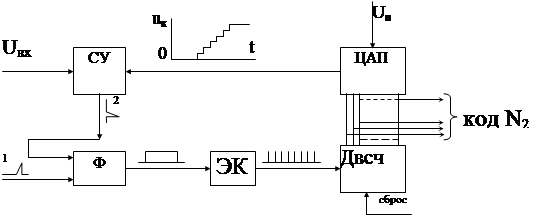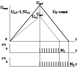 Когда напряжение Uk окажется равным напряжению Ux (Uk=Ux), сработает СУ и на его выходе появится импульс 2, который переведет формирователь в положение «0». При этом ЭК закроется и поступление импульсов на счетчик прекратится. На выходе счетчика установится код N2, соответствующий значению измеряемого напряжения Ux.